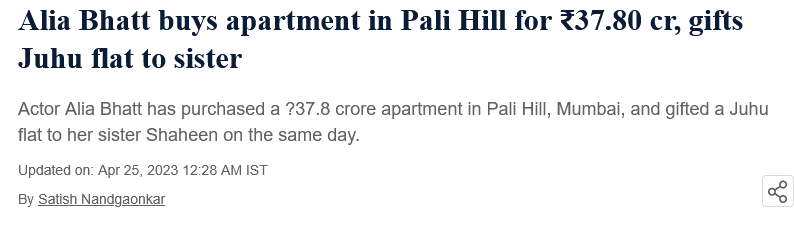 On April 10, 2023 – squarely within the forecast window – Alia Bhatt purchased a 2,497 sq ft apartment in the upscale Pali Hill locality of Bandra for Rs. 37.80 crore. The property was registered in the name of her production house, Eternal Sunshine Productions Pvt Ltd. She paid a stamp duty of Rs. 2.26 crore on the transaction.