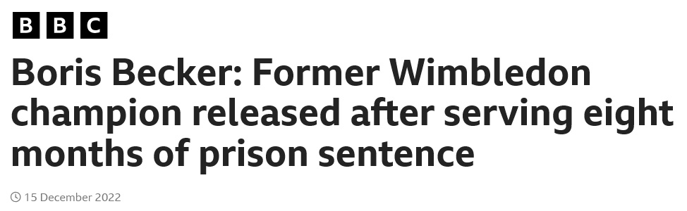 On December 15, 2022, Boris Becker was released from prison after serving approximately eight months of his thirty month sentence. He was deported to Germany immediately upon release.